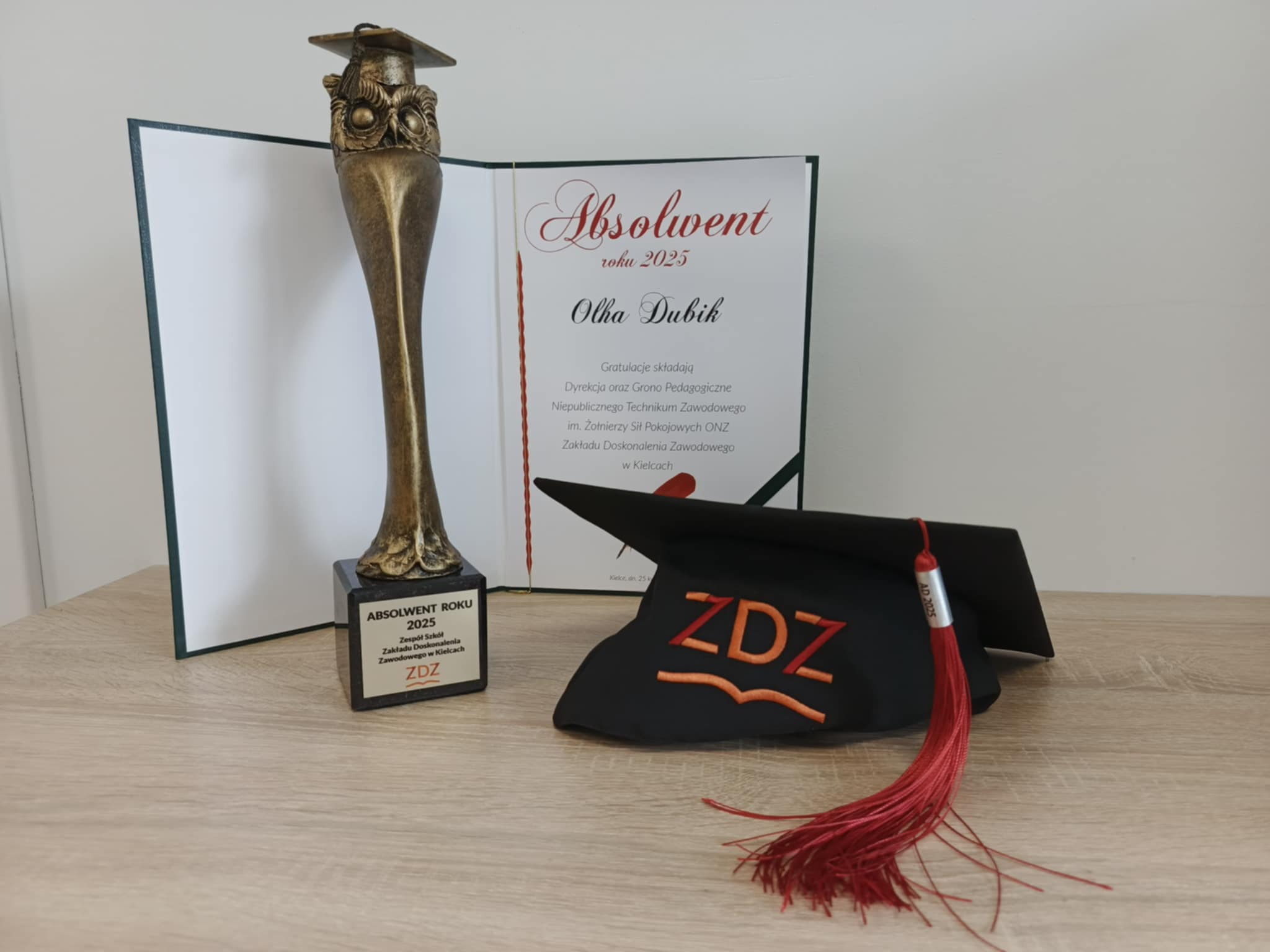 W miniony piątek absolwenci Liceum Ogólnokształcącego i Technikum Zawodowego ZDZ w Kielcach świętowali uroczyste zakończenie szkoły. Naszą tradycją jest szczególne wyróżnienie najlepszego absolwenta. W bieżącym roku statuetkę odebrała z rąk Dyrekcji Szkoły Olha Dubik - absolwentka Technikum Zawodowego w zawodzie technik hotelarstwa. Serdecznie gratulujemy i życzymy dalszych sukcesów.